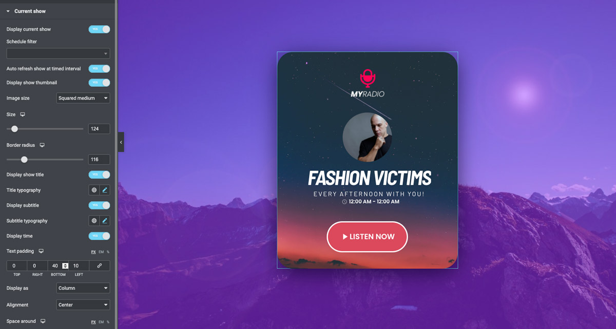 This is an example of the new Custom Radio Player Builder: create any radio player visually with Elementor, display the current show, song, artwork, logo, button and custom background. Any size, any color, any positioning, including fixed!